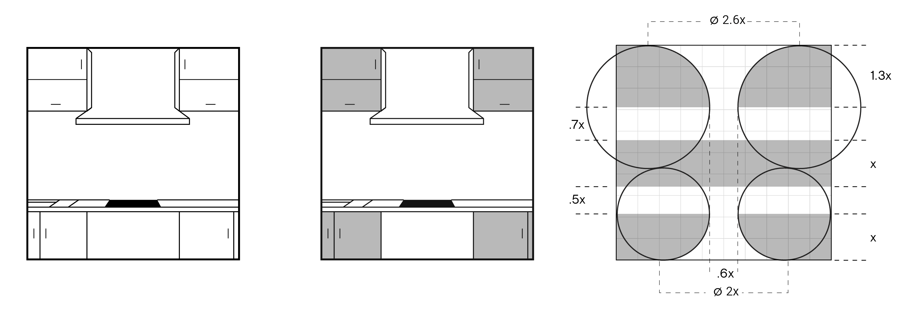 The logo is inspired by the modular structure of a kitchen, translating its layered organization into a visual system. The three sections represent overhead storage, a central work surface, and the base, forming a balanced and structured composition.