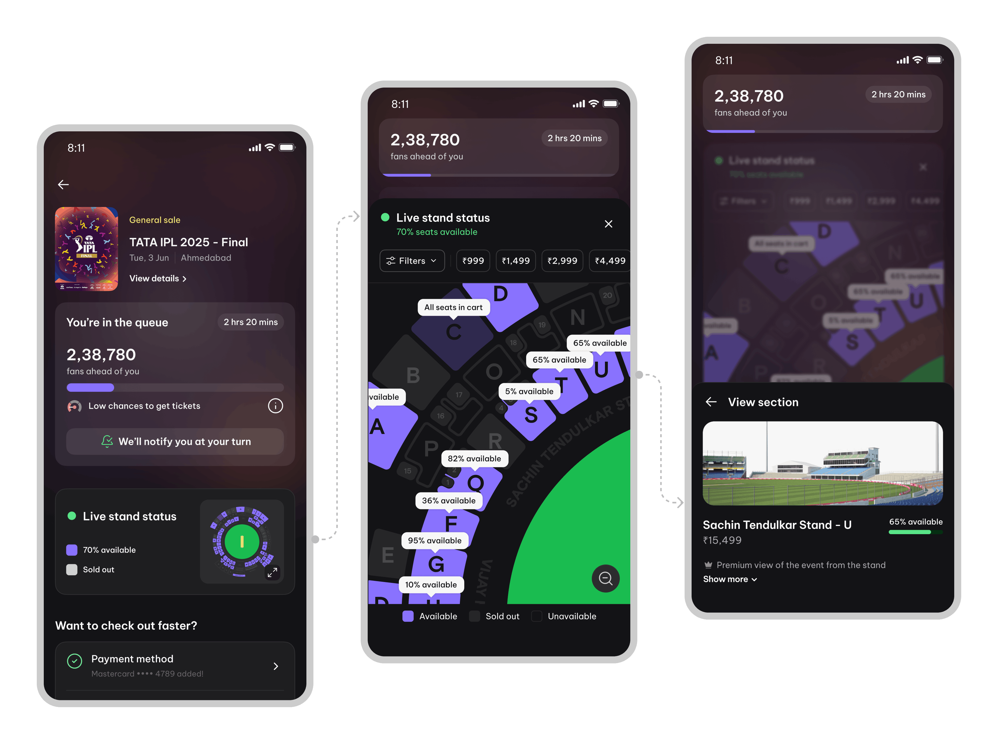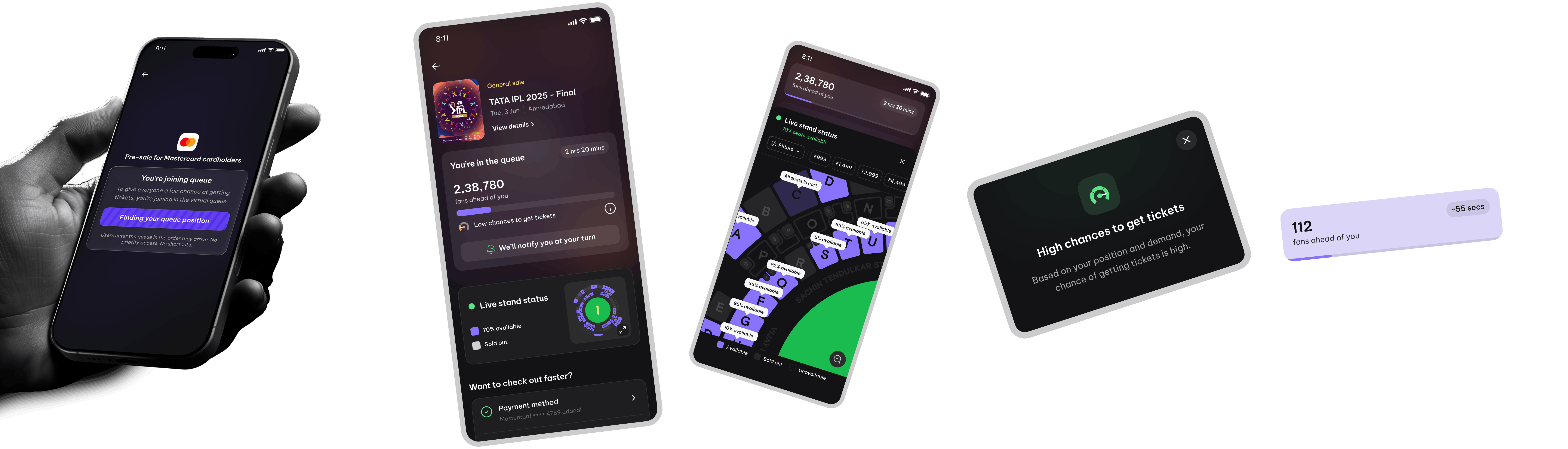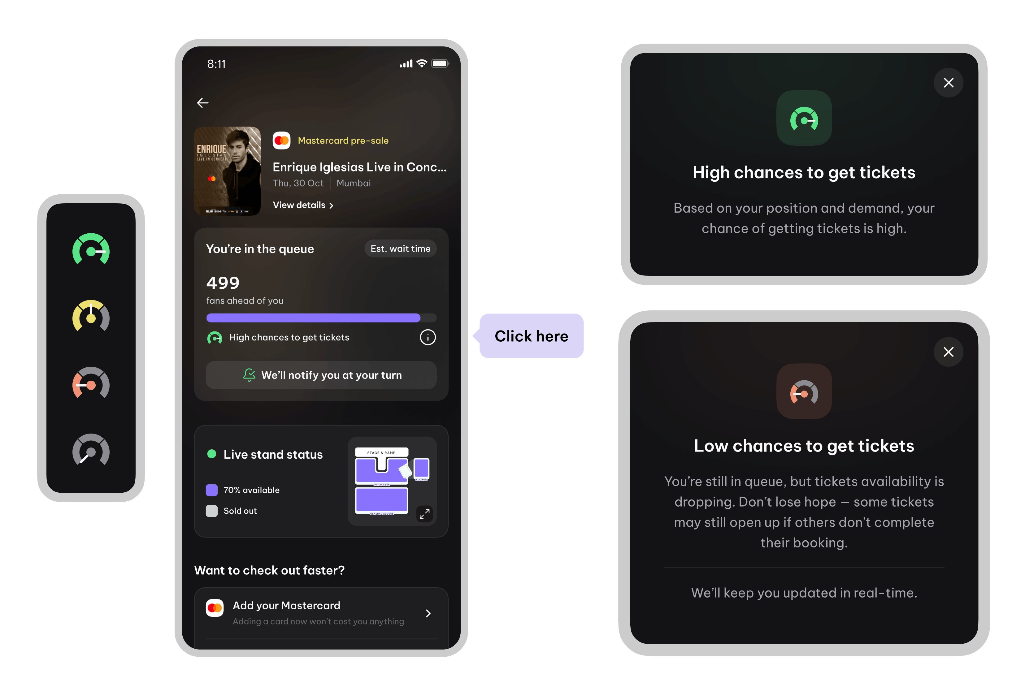 Live seat availability and probability indicators allow users to decide on alternatives while waiting. This helps them move through checkout more quickly once their turn arrives.